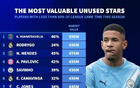 德转列本赛季联赛参赛比例不足50%身价前15:KK、罗德里戈前2
